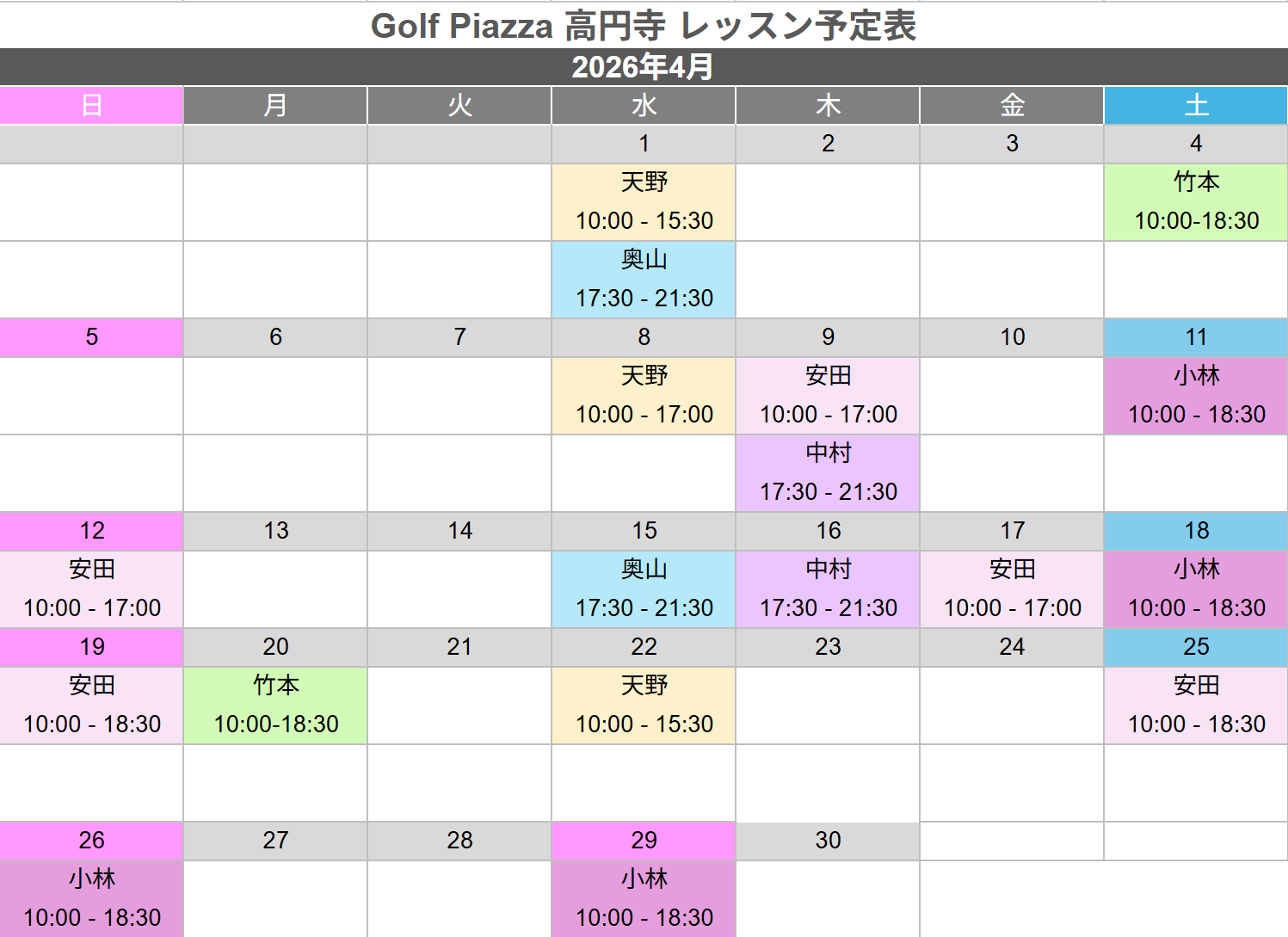 2026年3月と4月のレッスンプロのシフト表をご案内いたします。